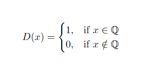 Can you have a function continuous nowhere? This one is where I think calculus intuition starts to fail us. The answer is surprisingly yes! An example is called Dirichlet’s function. It’s a very weird function and is defined as follows,