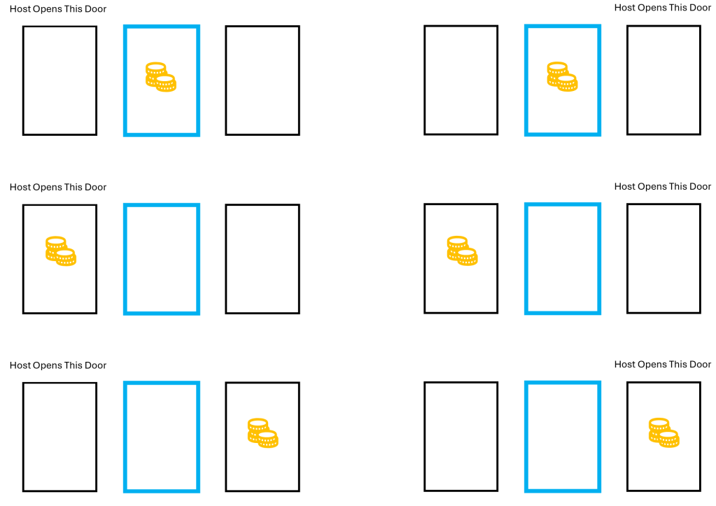 Notice that we have, at first, six possible outcomes. However, since we are working under the assumption that the door the host opened was empty, we can widdle down these six to just four of these outcomes.